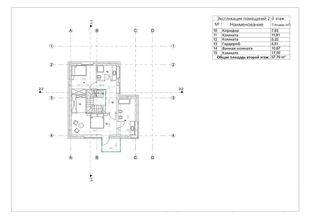 - Общая площадь второй этаж 57,79 м²