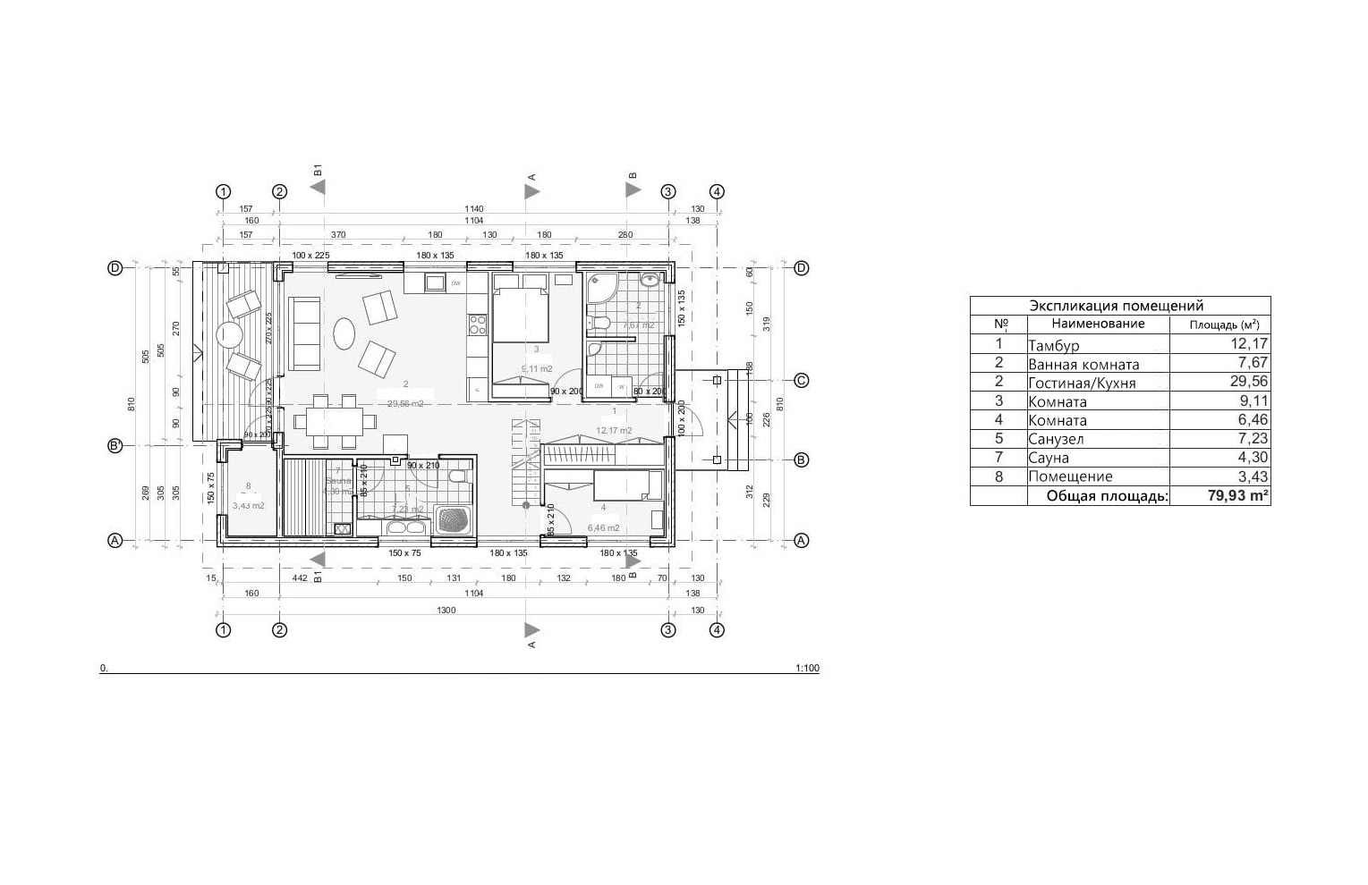 - Общая площадь первый этаж 79,93 м²