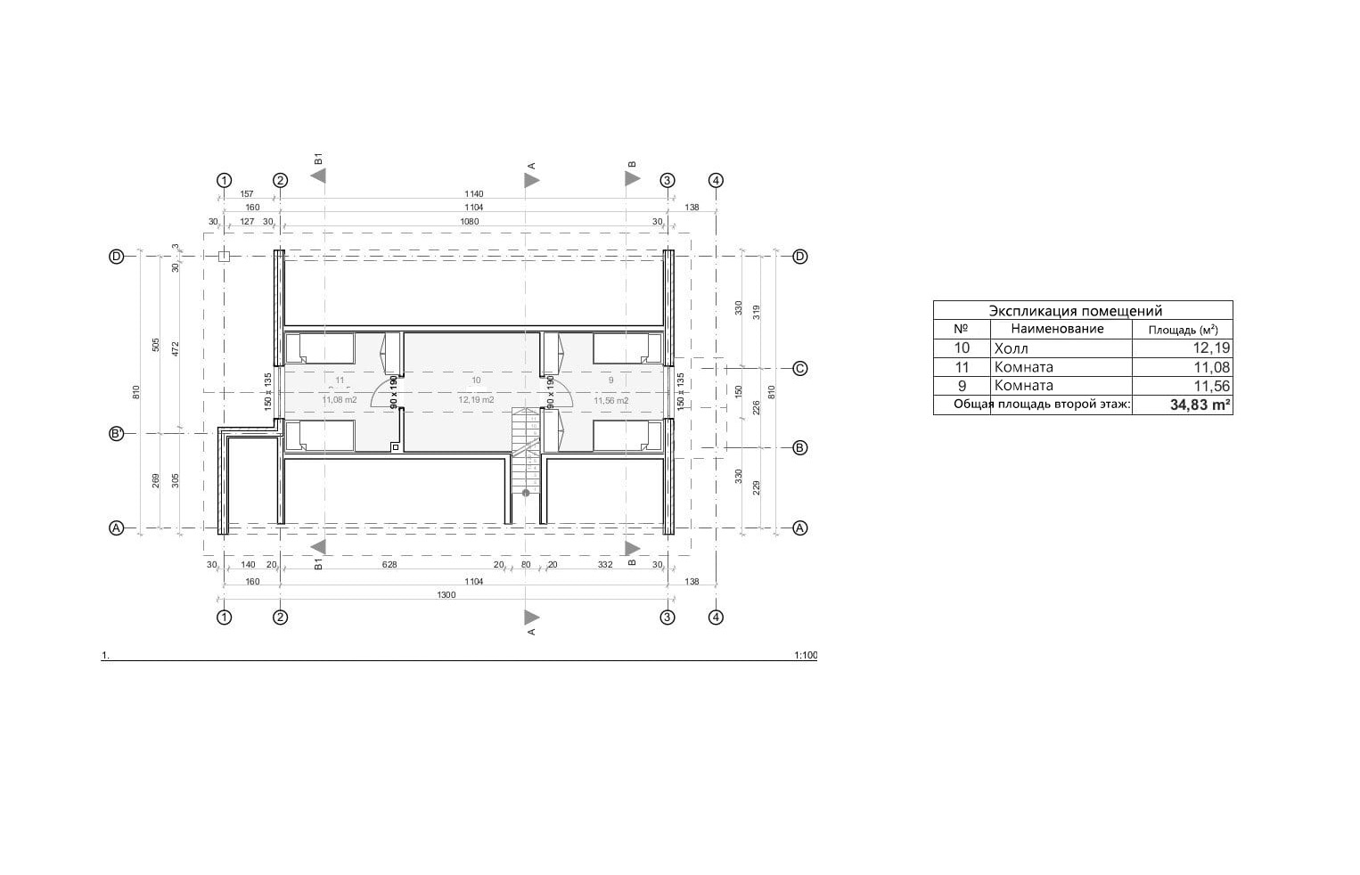 - Общая площадь второй этаж 34,83 м²