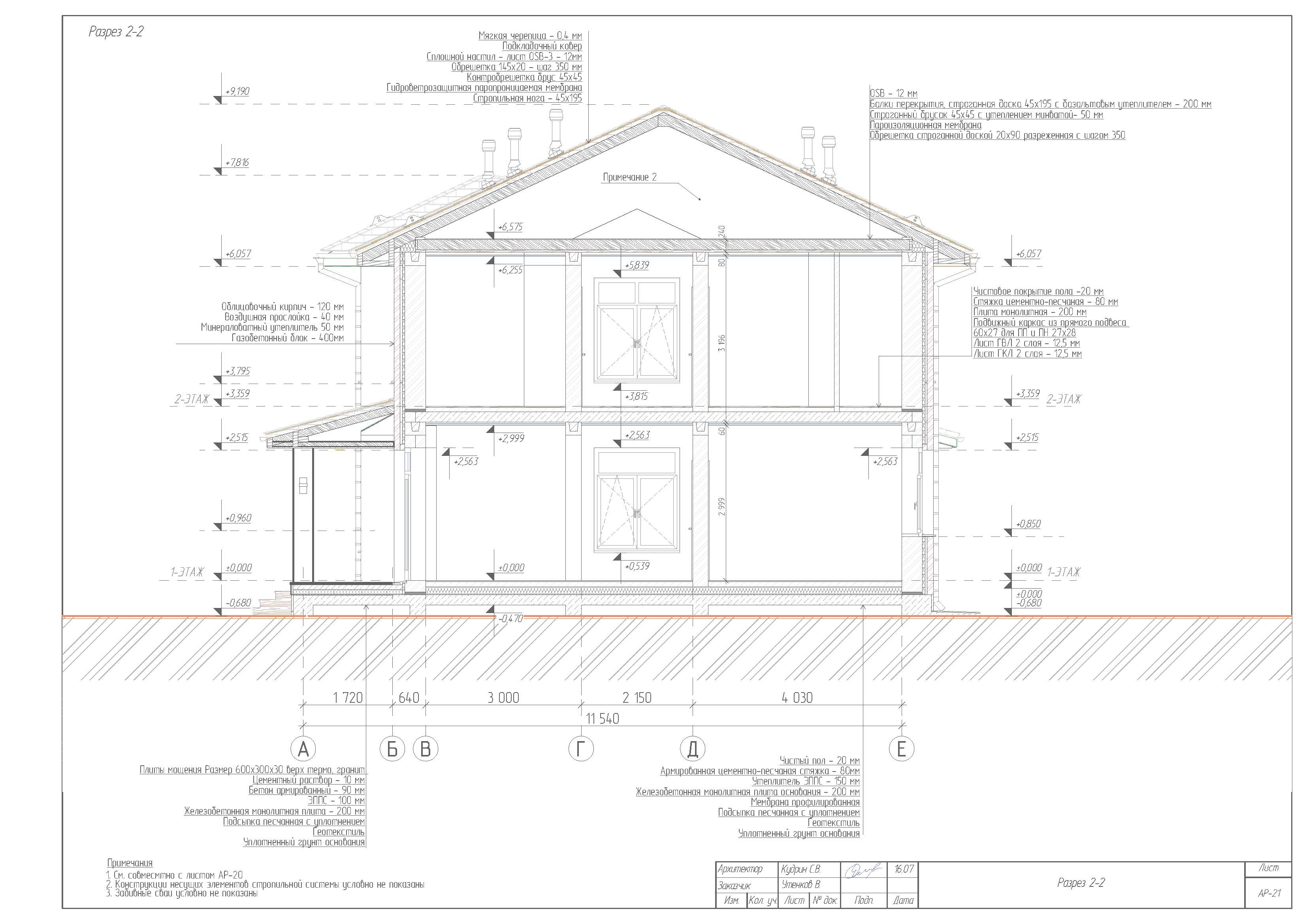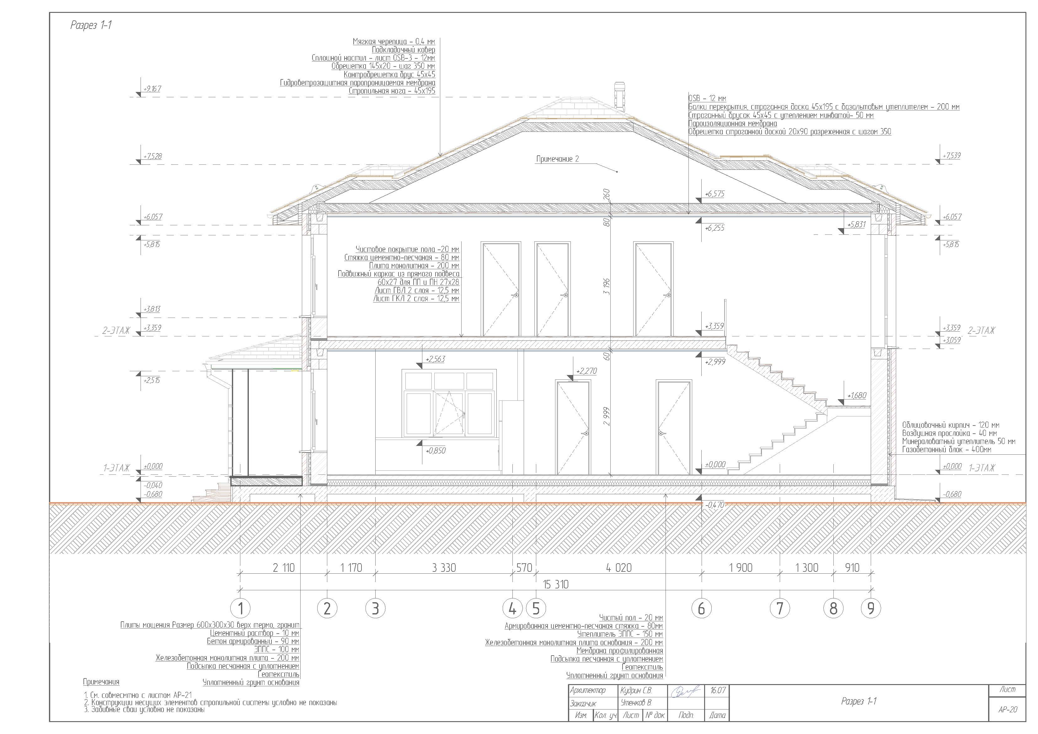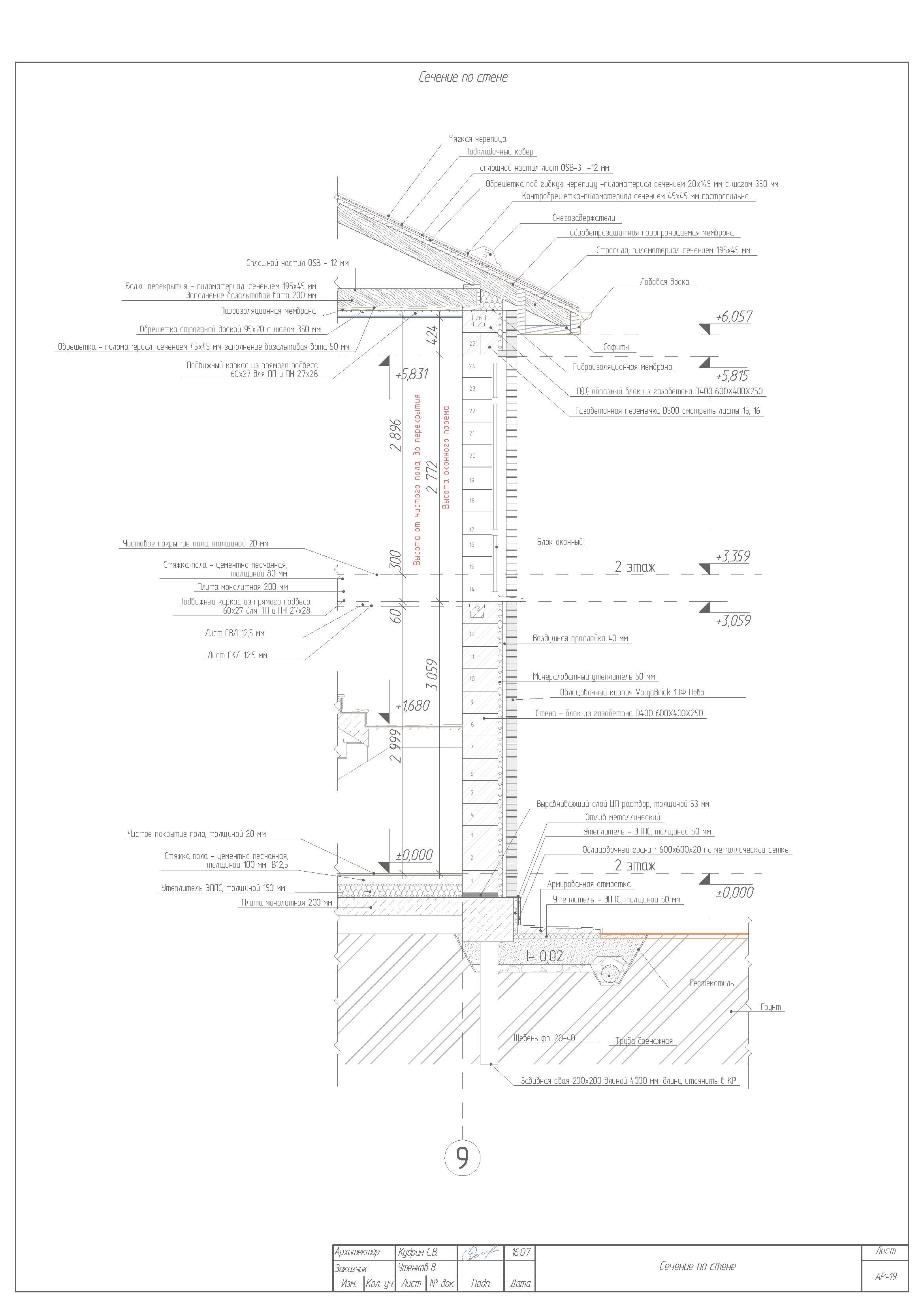 - Наружные стены: утепленные минераловатной плитами толщиной 50 мм, газобетонные блоки 600х400х250, марки D400. Облицовочный кирпич 250х120х65 с воздушной прослойкой 40мм.Внутренние несущие стены: газобетонные блоки 600х300х250, марки D600. Межкомнатные перегородки из газобетонного блока 600х100х250 марки D600.
