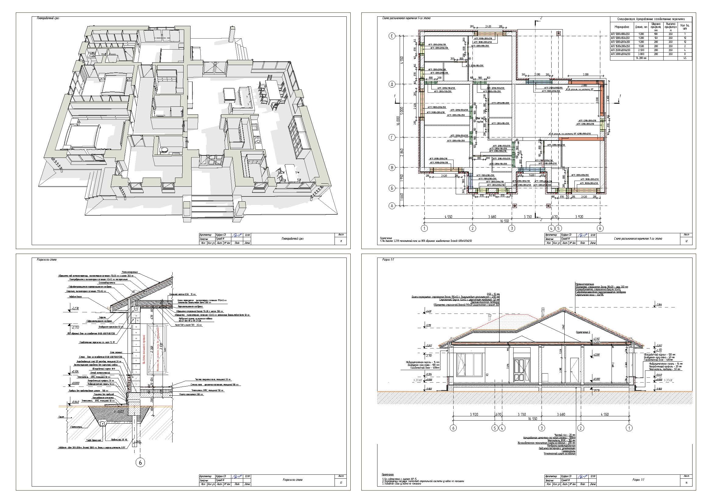 - Внутренние несущие стены: газобетонные блоки 600х300х250, марки D600.