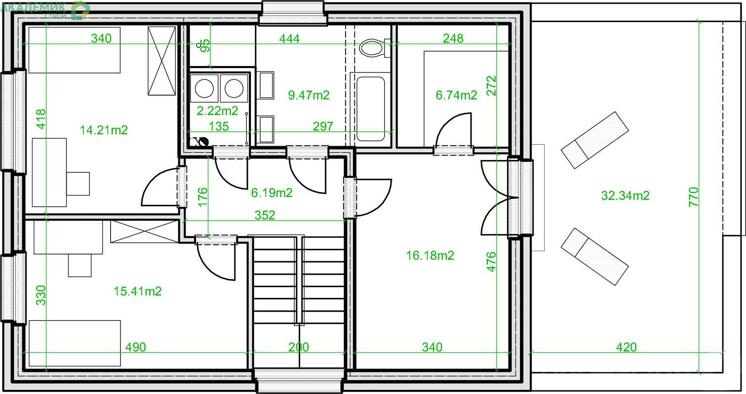 Также в проекте предусмотрена терраса — полузакрытое пространство рядом с домом, которое позволяет организовать отдых на свежем воздухе, устроить семейные ужины или просто релаксацию. Терраса служит прекрасным продолжением жилой зоны, объединяя дом с природой и создавая ощущение простора.
