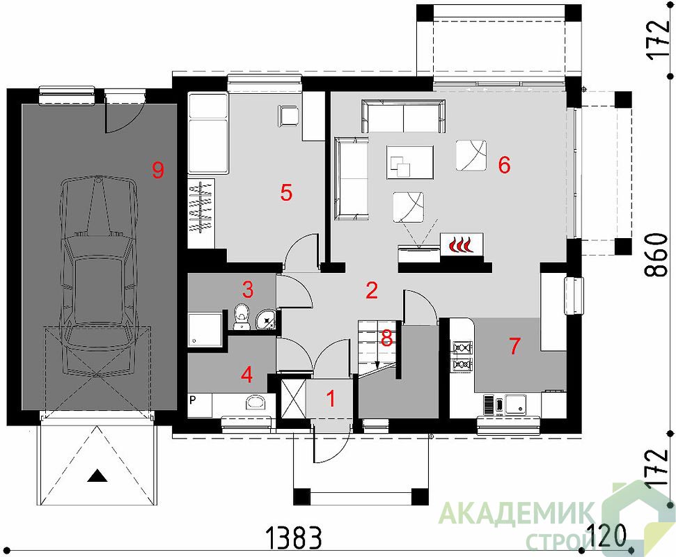 Наименьшая возможная ширина участка, необходимая для строительства выбранного дома. Состоит из длины фасада дома плюс с обеих сторон три метра отступ.