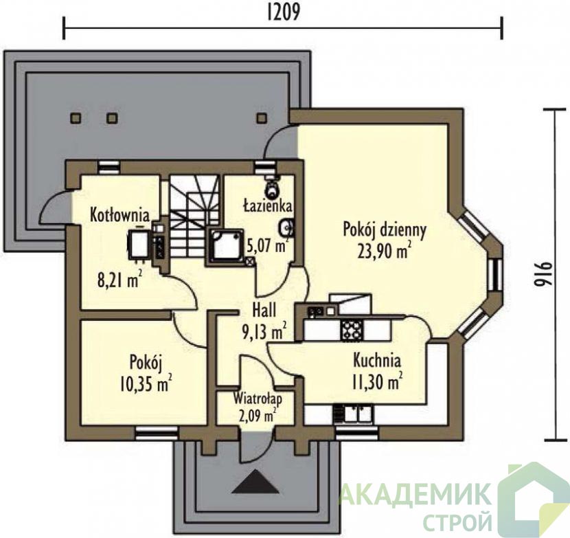 Эркер выступает не только как декоративный элемент, но и выполняет функциональную задачу — расширяет внутреннее пространство одного из помещений первого этажа, увеличивая естественное освещение и визуальное восприятие комнаты. Это особенно ценно в условиях ограниченного пространства.