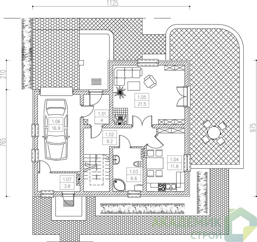 Терраса – дополнительная жилая зона на открытом воздухе, которая расширяет возможности для отдыха и развлечений на свежем воздухе в теплое время года. Возможность расположения террасы на солнечной стороне участка делает её особенно привлекательной для завтраков на рассвете или вечерних посиделок.