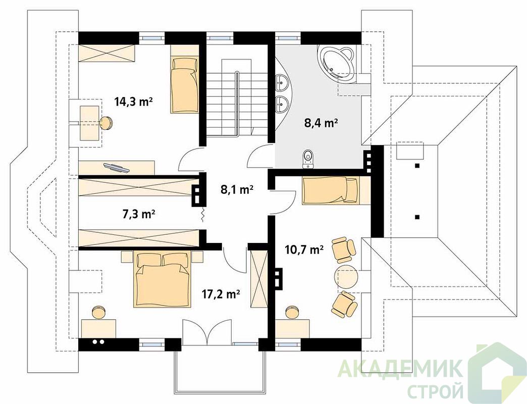 Особое внимание заслуживает эркер – архитектурное дополнение, которое призвано визуально расширить помещения, добавить естественного света и создать уютный уголок. В проекте дома от "Академик Строй" эркер отлично гармонирует с общим стилем, выступая своеобразной "визитной карточкой" фасада.