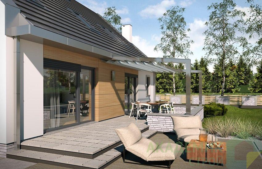 Проект не включает гараж, однако есть навес для машины, который защитит автомобиль от осадков и позволит экономить средства на строительстве полноценного гаража. При желании такой навес можно использовать и как дополнительное пространство для хранения сезонных вещей или инструментов.