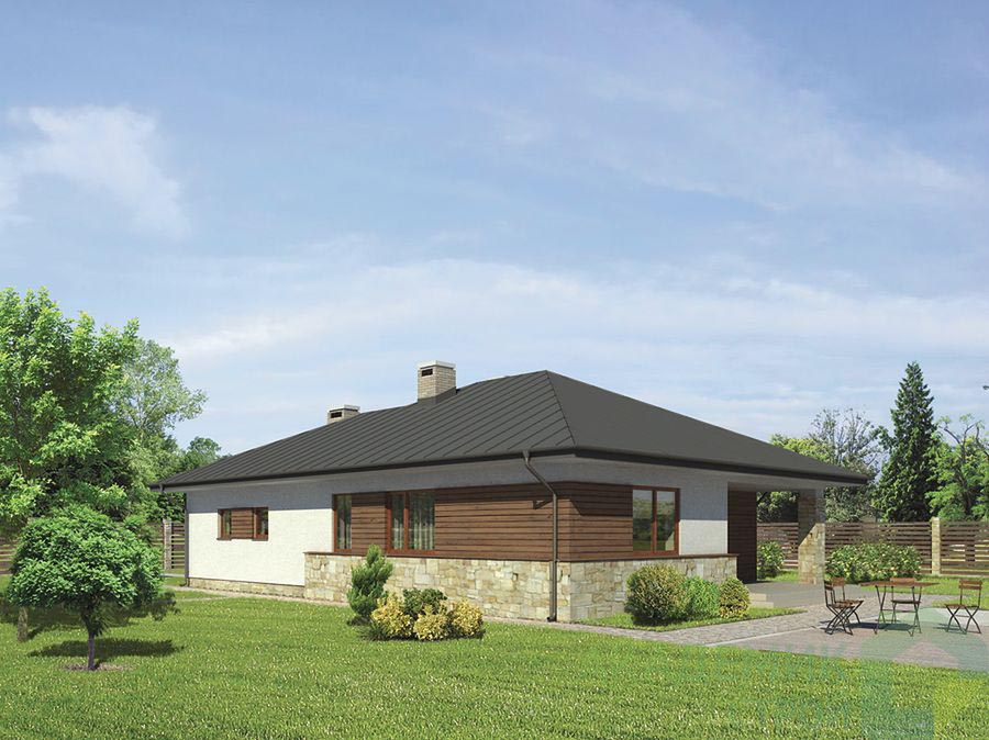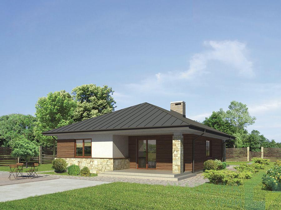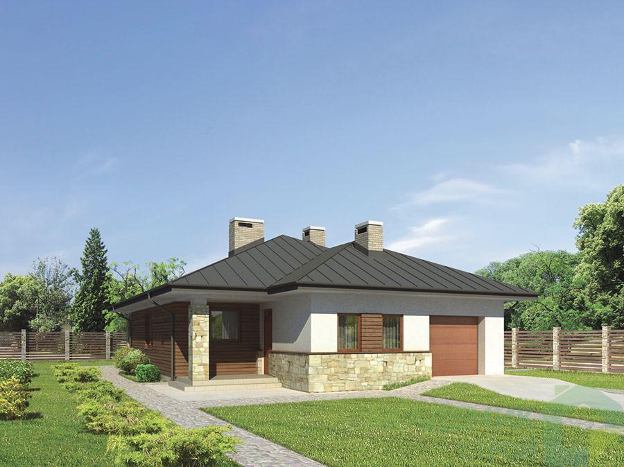 Одноэтажный дом 11x16 м характеризуется стильной и надёжной кровлей с углом наклона 25°, разновидностей которой несколько. В проекте предусмотрена сложная форма крыши, объединившая в себе двускатные и вальмовые элементы, что обеспечивает не только отличный внешний вид, но и эффективный сток дождевой воды, снега.