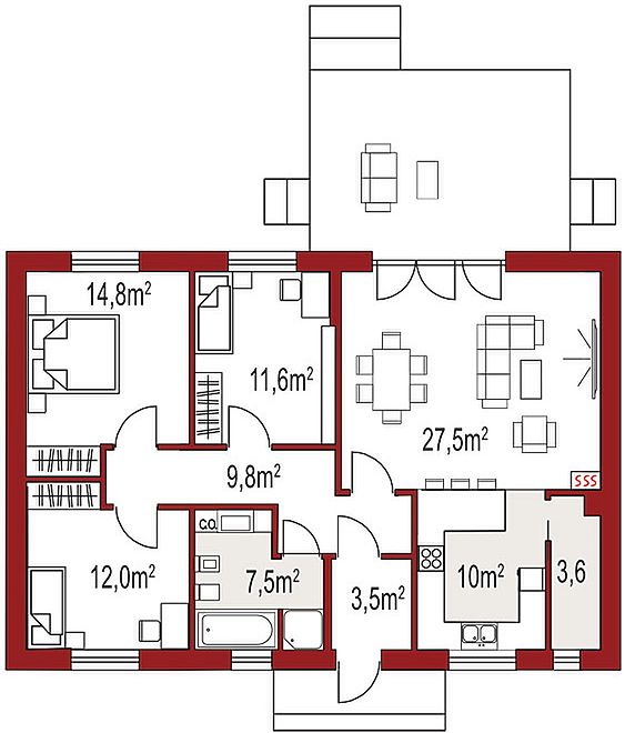 Дом рассчитан на 3 комнаты для отдыха и полноценного ночного сна — это идеальный вариант для семьи из 3-5 человек. Одна санузловая комната хорошо спланирована и гармонично вписывается в общую структуру, что снижает затраты на коммуникации и обслуживание.