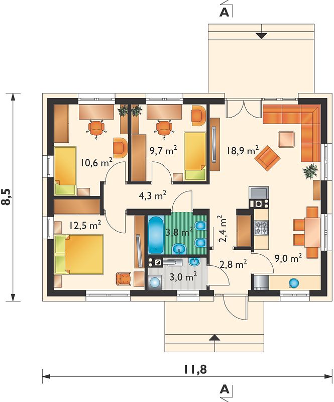 Одно из главных преимуществ одноэтажного дома 12x8 – грамотная планировка. Проект от «Академик Строй» предусматривает 3 спальни, что идеально подходит для семьи с детьми или с пожилыми родителями.