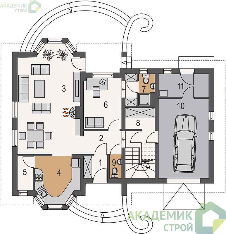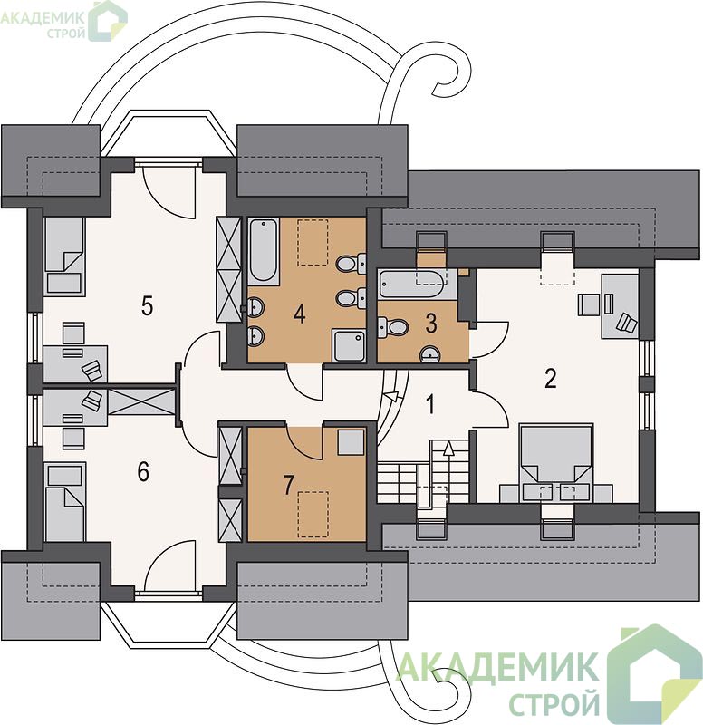 Что же получает покупатель, кроме внушительных размеров самой постройки? Компания "Академик Строй" предлагает продуманный проект с разделением пространства на общественные и личные зоны. Это позволяет членам семьи чувствовать себя комфортно, не мешая друг другу.