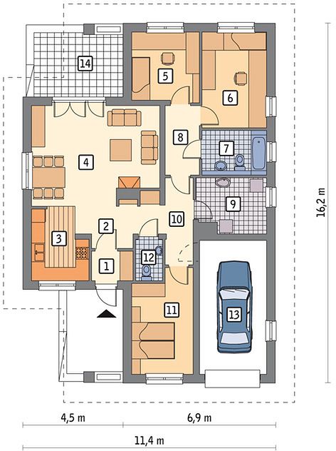 Почему именно 11 на 16 метров? Эти размеры оптимальны для участка средней площади, при этом позволяет эффективно спланировать внутреннее пространство, разместив все нужные комнаты и зоны. Проектов одноэтажных домов много, однако именно здесь собраны все востребованные опции, которые делают жизнь удобной и приятной, включая три спальни, два санузла, просторную гостиную с камином и даже террасу – идеальное место для вечернего чая или встреч с друзьями.
