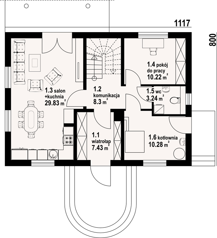 Размеры дома 11 на 8 метров — это классический пропорциональный прямоугольник, который отлично вписывается на участки минимальных размеров 19.17 м в ширину и 16 м в длину. Такая планировка позволяет выдержать оптимальное расстояние до границ соседских участков и одновременно защитить приватность хозяев.