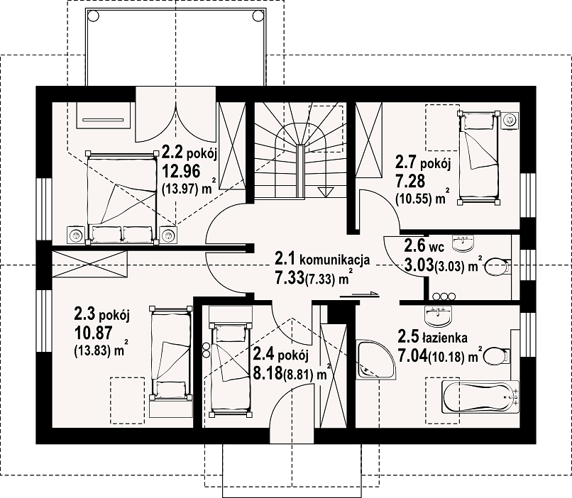 Проект дома включает в себя пять и более спален, что делает его отличным вариантом для большой семьи или для тех, кто часто принимает гостей. Такое количество спальных комнат дает возможность каждому члену семьи иметь персональное пространство для отдыха, что особенно ценно в современных условиях.