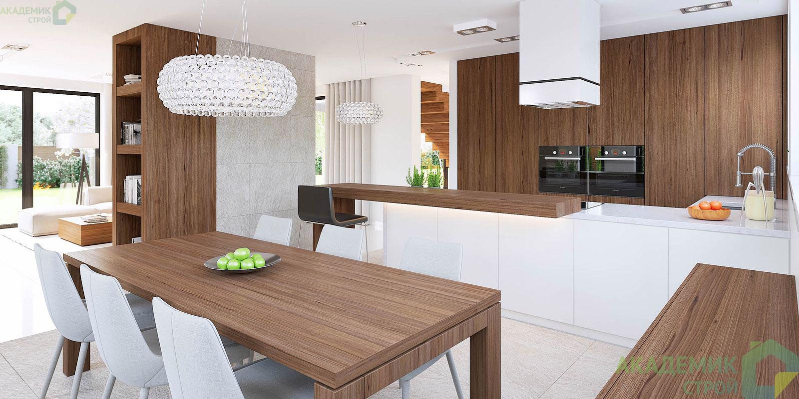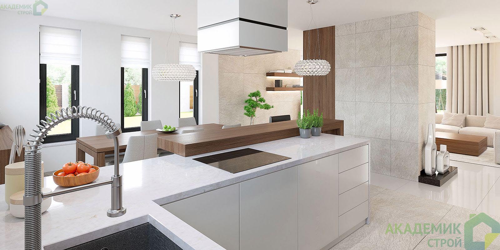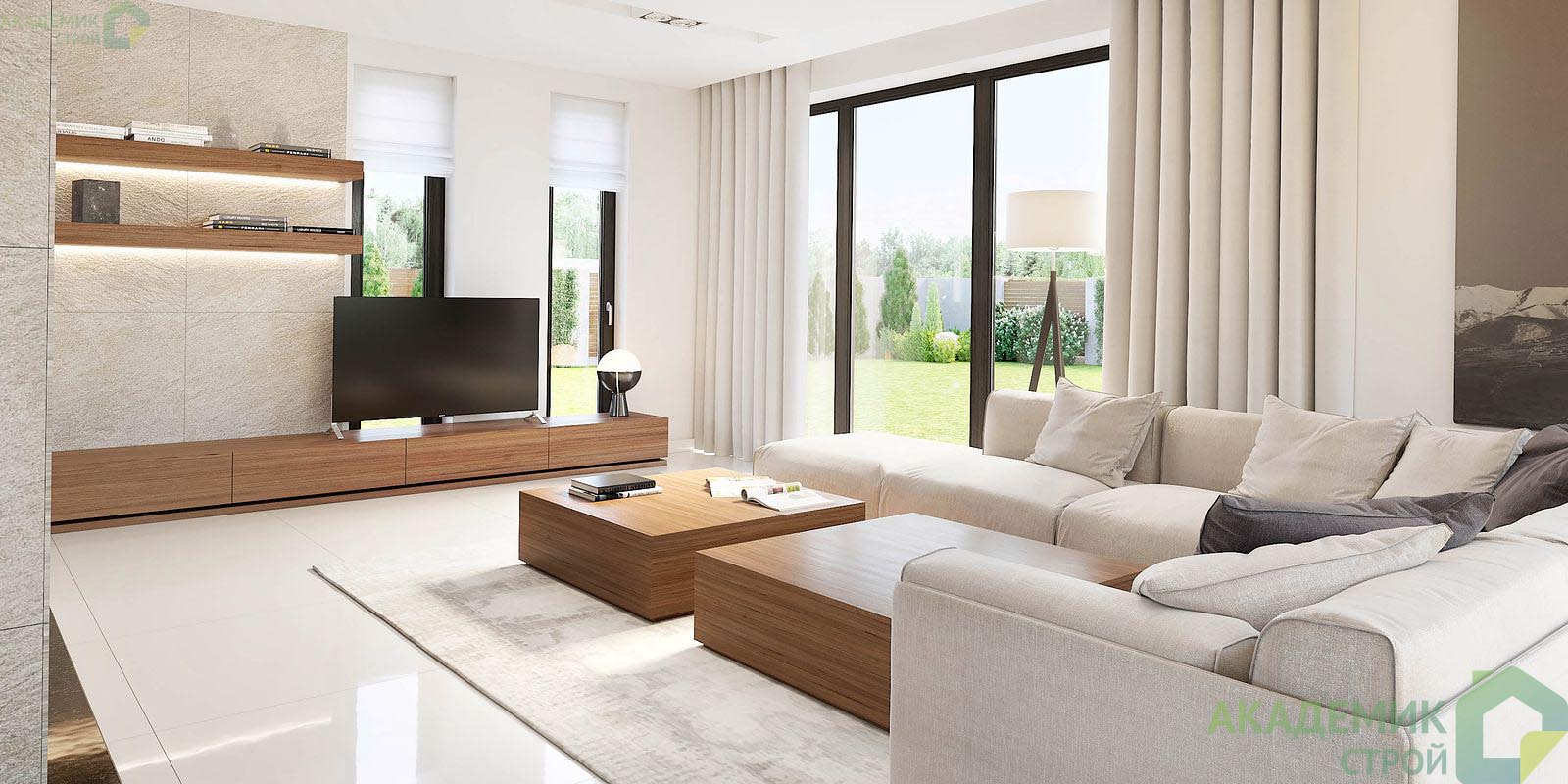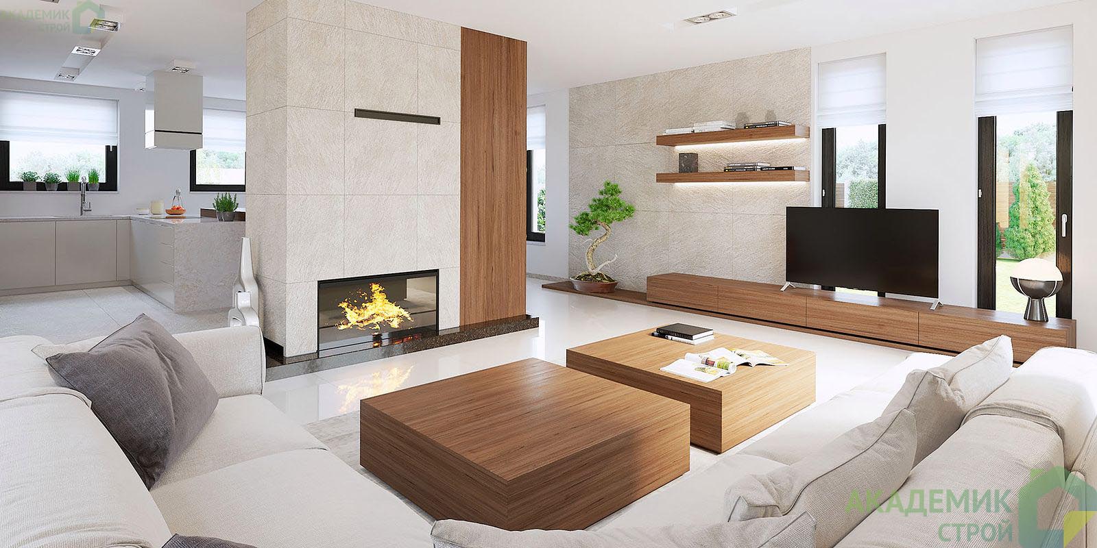 При разработке дизайн-проекта можно выбрать любые современные или классические отделочные материалы: декоративную штукатурку, натуральное дерево, облицовочный кирпич. Благодаря крупным окнам комнаты будут залиты дневным светом. Терраса гармонично «встраивается» в архитектуру, а зона камина выступает акцентом гостиной и фасада.