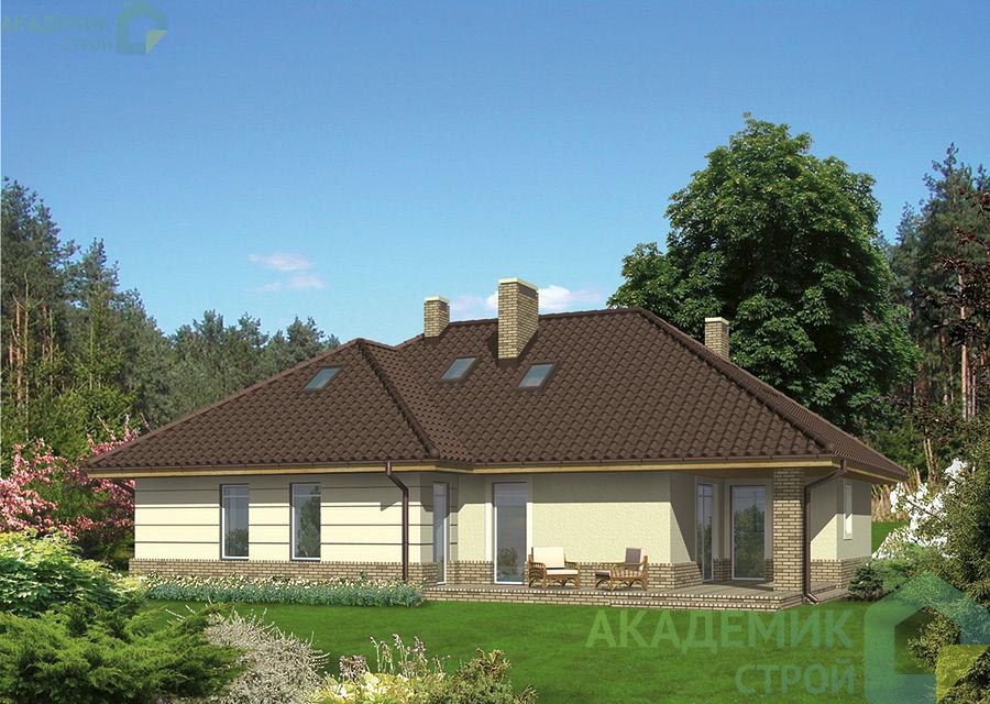 Терраса, предусмотренная в проекте, позволяет организовать прекрасное место для отдыха на свежем воздухе. Она удобно располагается рядом с гостиной и станет любимым уголком и для взрослых, и для детей в тёплую пору года.