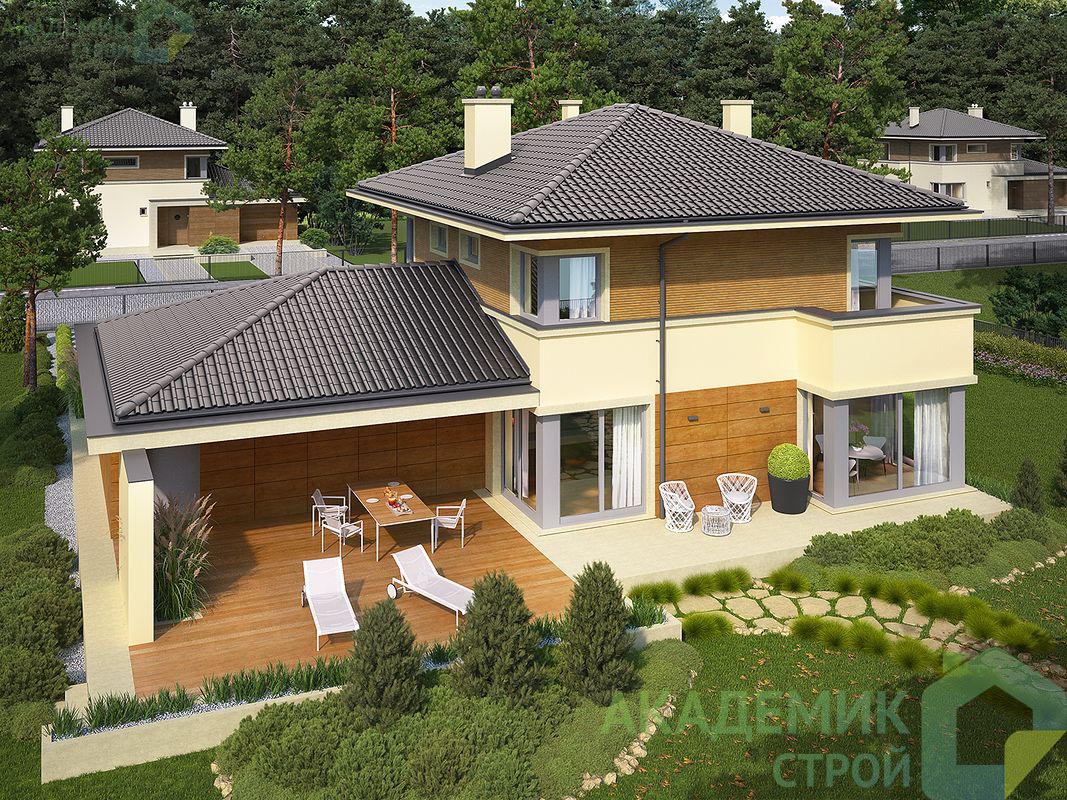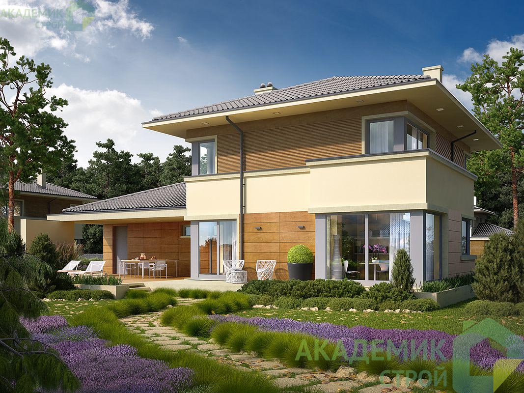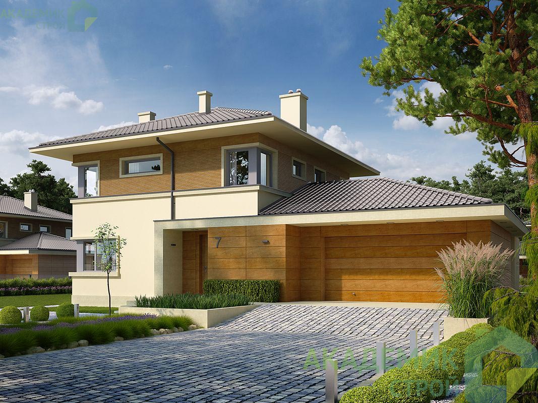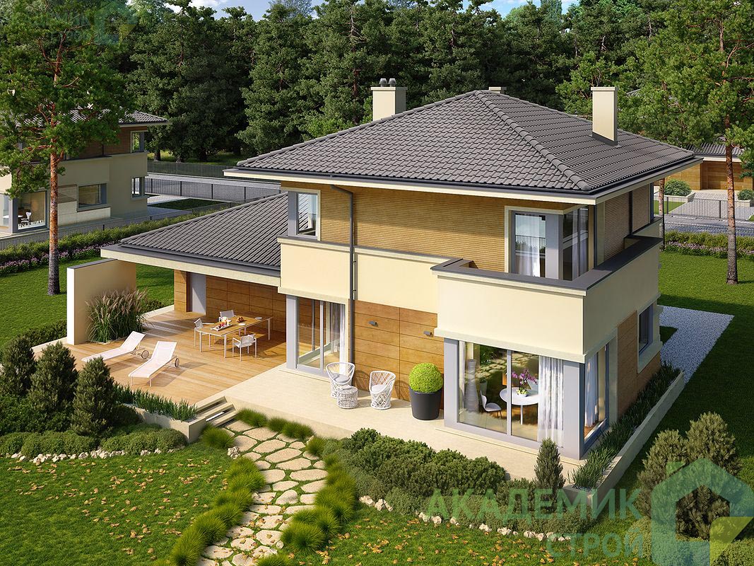 Дом 17x13 м с площадью почти 175 м² выполнен в современном архитектурном стиле, совмещающем классические и современные тенденции. Сложная крыша с углом наклона 22° добавляет объемности и динамичности фасаду. Использование натуральных материалов в отделке фасада, таких как кирпич, дерево или декоративный камень, придает зданию выразительный и элегантный вид.