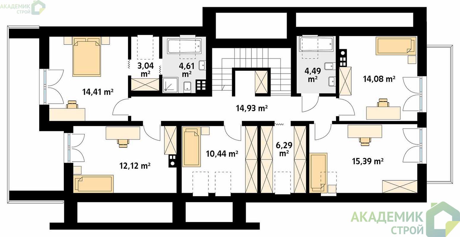 Такое разделение позволяет избежать скопления людей в одном месте и создает ощущение приватности. Для семей с детьми это особенно важно, так как спальни находятся в более тихой части дома, отдаленной от общих зон.
