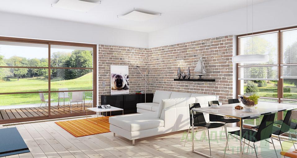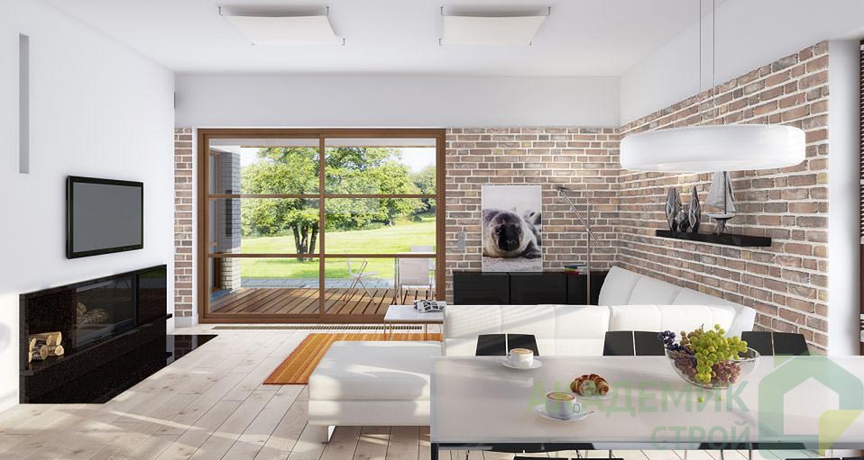 Любителям домашнего уюта понравится предусмотренный в проекте камин – он создает атмосферу тепла в гостиной, особенно в холодные зимние вечера.