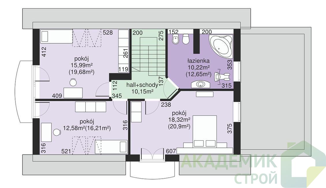 Площадь крыши – 205,48 м2, что несколько превышает площадь застройки, что объясняется скатами и выступами. Объем дома в брутто составляет 674,60 м3, что говорит о хорошем объеме помещения при двух этажах и достаточно высоком внутреннем пространстве.