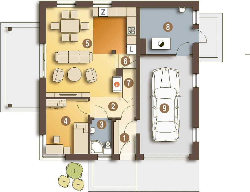 Проект включает такие приятные и востребованные опции, как терраса и камин. Терраса — это отличное место для семейных вечеров на свежем воздухе, праздников или занятий хобби. Особенно в летний период она становится любимым уголком дома для всех членов семьи. Установка камина делает интерьер своего рода центром притяжения в доме, усиливая впечатление тепла и уюта.