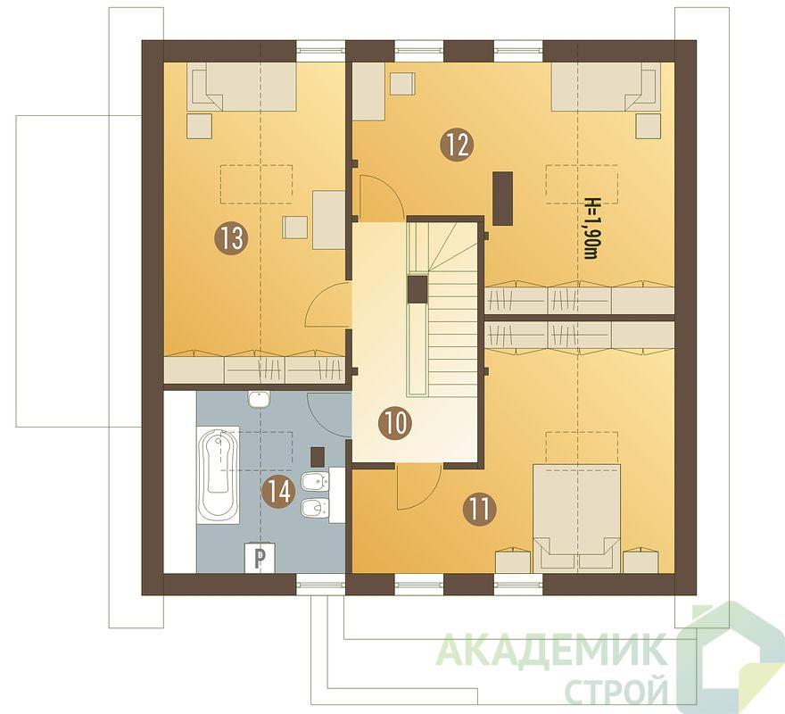 Второй этаж предназначен для четырех спален. Это помещение может быть организовано как приватная зона для отдыха каждого члена семьи. Планировка позволяет эффективно использовать площадь, делая комнаты функциональными и комфортными. Кроме того, предусмотрены два санузла — на каждом этаже по одному, что значительно повышает уровень комфорта и функциональности дома.