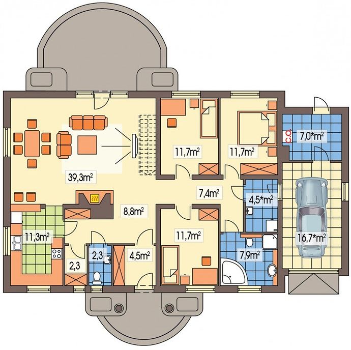 В доме запроектированы пять и более спален, что делает его отличным вариантом для больших семей или тех, кто предпочитает иметь гостевые комнаты, кабинеты или детские комнаты. Общая жилая площадь составляет почти 119 м², что свидетельствует о том, что проект ориентирован именно на создание уютных жилых зон.