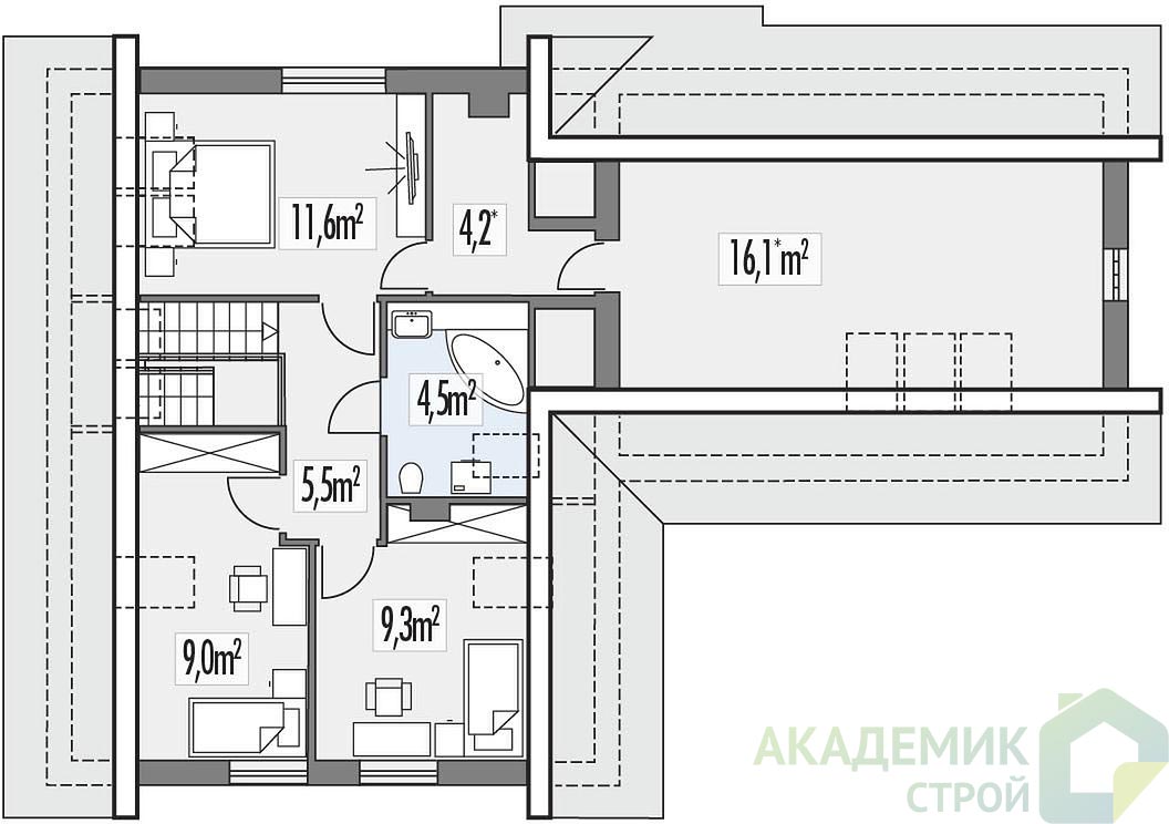 Проект предусматривает четыре удобные спальни — идеальный выбор для семьи из четырёх-пяти человек. Значительная жилая площадь в 108,5 м² гарантирует, что в каждом жилом помещении будет достаточно пространства для комфортного проживания, отдыха и работы. Таким образом, дом одновременно становится уединённым местом для каждого члена семьи и общей территорией для семейных встреч.