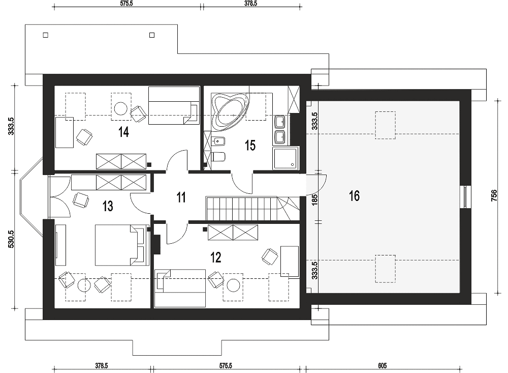Высота дома 8,7 метра и конструкция с двускатной крышей с углом наклона 40°, а также аттиковой стеной высотой почти один метр — это не только красивая архитектура, но и практичное решение для отвода осадков и максимального использования пространства второго этажа.