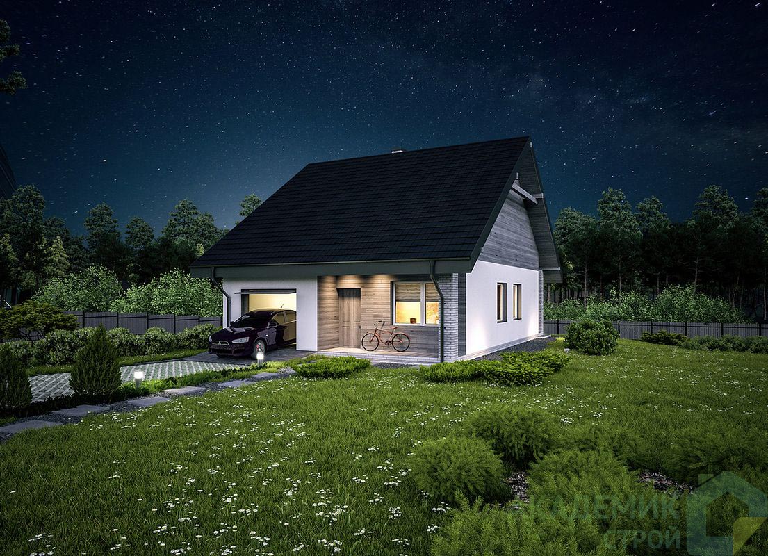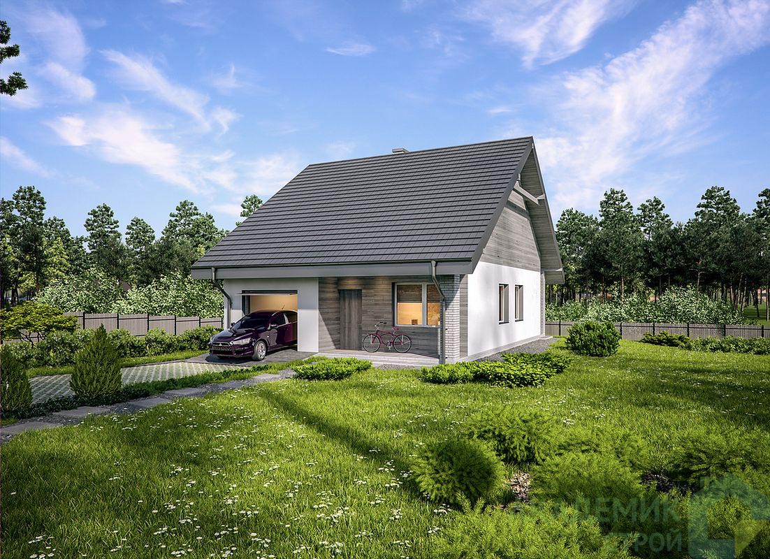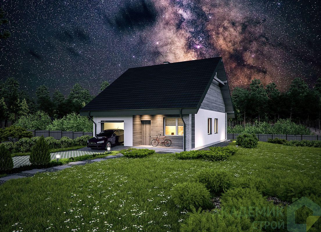 Несмотря на компактность, проект включает в себя всё необходимое для жизни комфортной семьи. Здесь одна просторная спальня, которая идеально подойдет для молодой семьи или пары, один санузел - обычно этого достаточно для дома такого размера. При этом общая жилая площадь — 61 м², что гарантирует хорошие условия для отдыха и личного пространства.