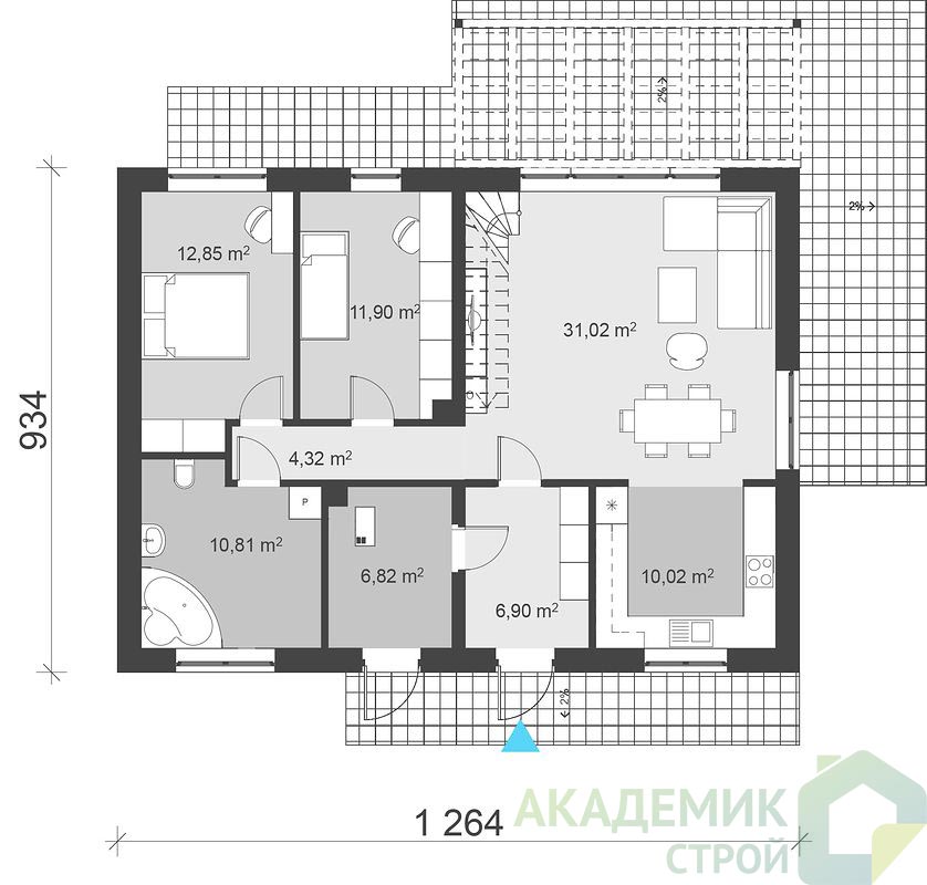 - Энергоэффективность за счёт компактности строения и сокращения теплопотерь через фундамент.