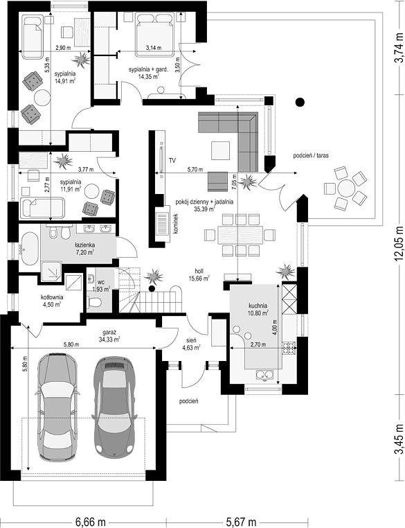 В доме используется эффектное сочетание классических форм с современными архитектурными элементами, где двускатная и вальмовая кровля придают узнаваемый и статусный облик. Такая крыша особенно популярна в Московской области, поскольку она придает дому надежность и эстетическую привлекательность.