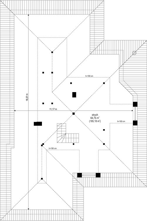 Крыша дома — настоящая изюминка проекта. Двускатная вальмовая крыша сложной формы с углом наклона 30° обеспечивает не только красивый внешний вид, но и практичность в эксплуатации. Такая конструкция надежно защищает от погодных условий и позволяет оптимизировать внутреннее пространство мансарды, если она предусмотрена.
