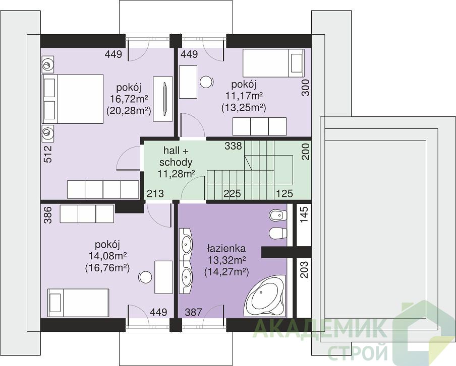 Под двускатной крышей с углом наклона 40° расположены спальни и дополнительные комнаты, которые имеют хорошие условия для естественного освещения и вентиляции. Это обеспечивает здоровую и приятную атмосферу для сна и отдыха.