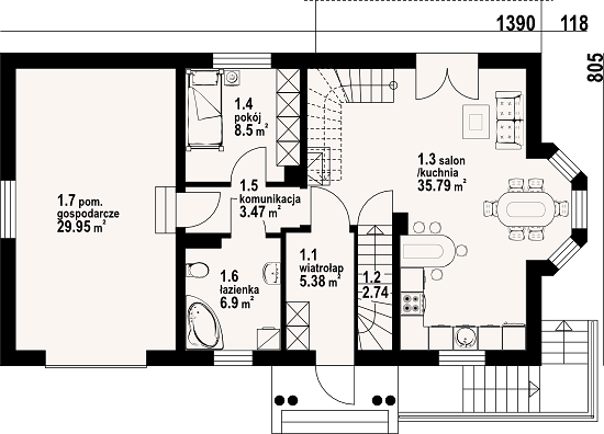 - Первый этаж: большая гостиная, кухня-столовая, комната для гостей или работы, санузел и технические помещения.