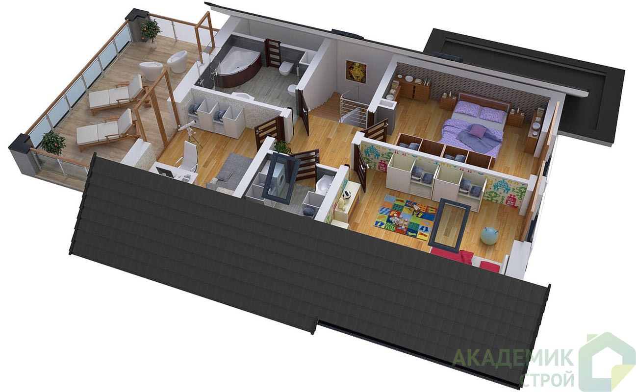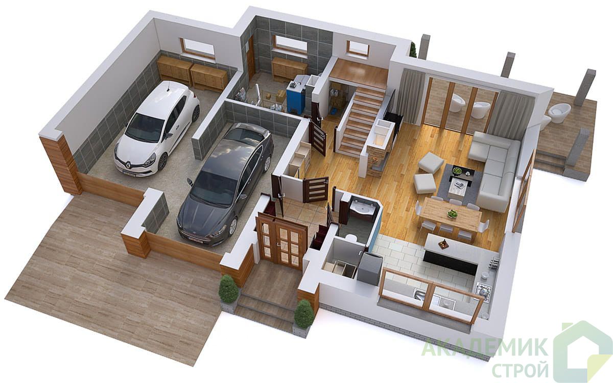Проект легко адаптируется под индивидуальные пожелания владельцев. Планировки комнат можно менять, добавлять или убирать стены, расширять зоны отдыха. Все это позволяет реализовать различные стилистические решения и сделать дом по-настоящему уникальным и уютным.