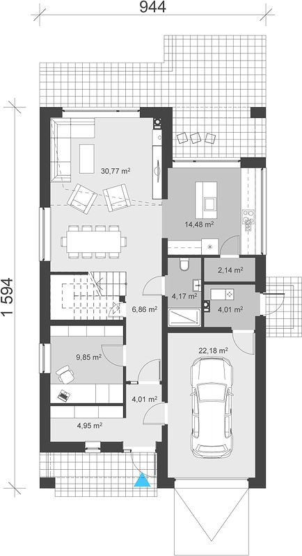 Размеры дома 9×16 метров обеспечивают комфортное распределение жилой и полезной площади. Застройка занимает 135 м², что оставляет достаточно места и для благоустройства территории, учитывая минимальные размеры участка, рекомендуемые под застройку — 17,44 метра по ширине и 23,94 метра по длине.