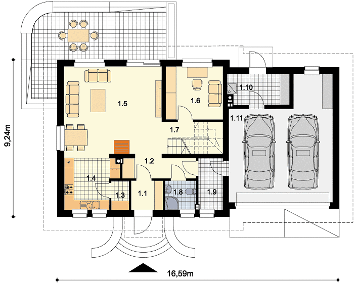 Здесь не придется жертвовать территорией под дом, оставляя достаточно пространства для сада, зоны отдыха и гаража или навеса — по желанию. Важно понимать, что при таких габаритах проект позволяет эффективно использовать каждый квадратный метр.