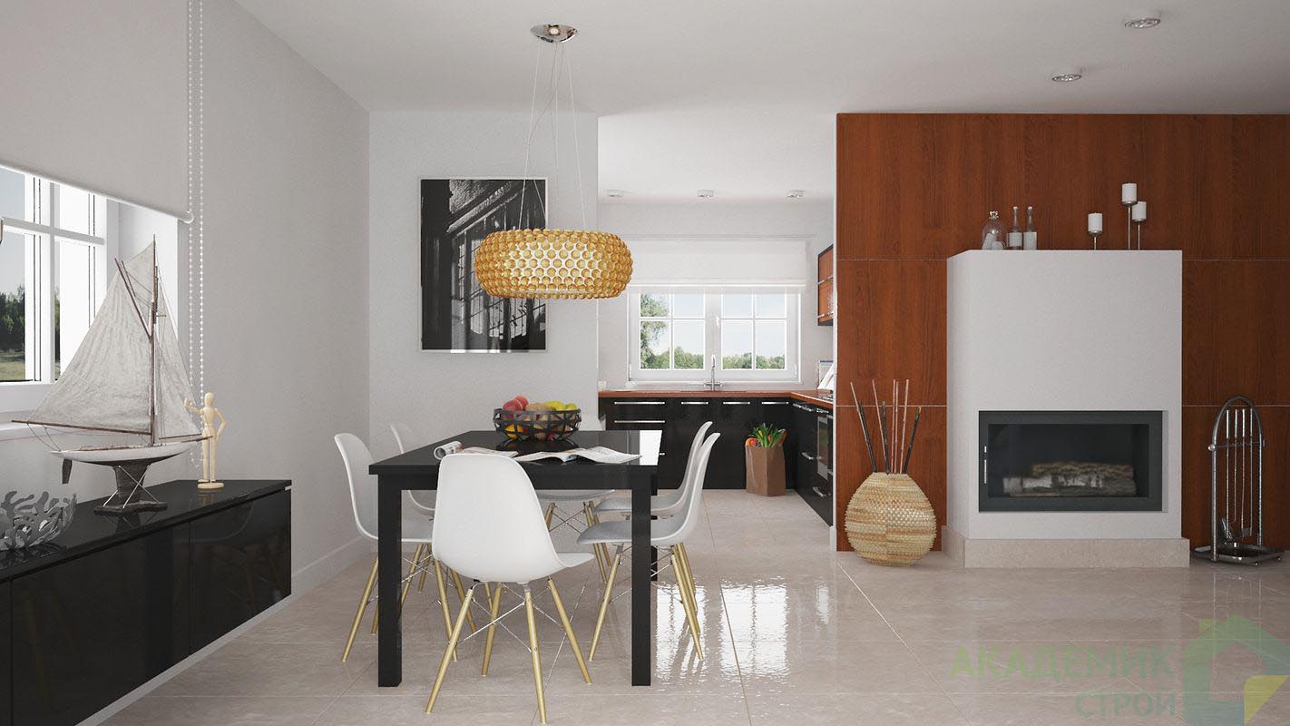 Дополнительно выделена зона для камина – важный элемент уюта и тепла любой загородной резиденции. Камин служит не только декоративным элементом, но и дополнительным источником отопления в холодное время года.