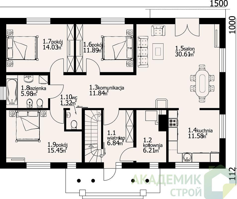 Габариты дома – 15 метров по ширине и 11 метров по глубине – позволяют с комфортом разместить все необходимые помещения, при этом не занимая слишком много места на участке. Форма плана упрощает выполнение строительных работ и снижает расходы на отделку фасада и крышу.