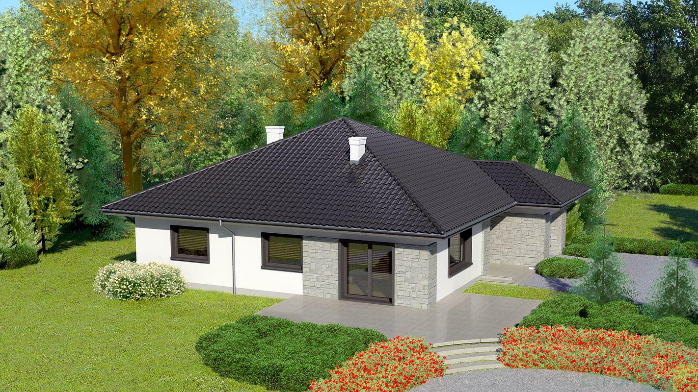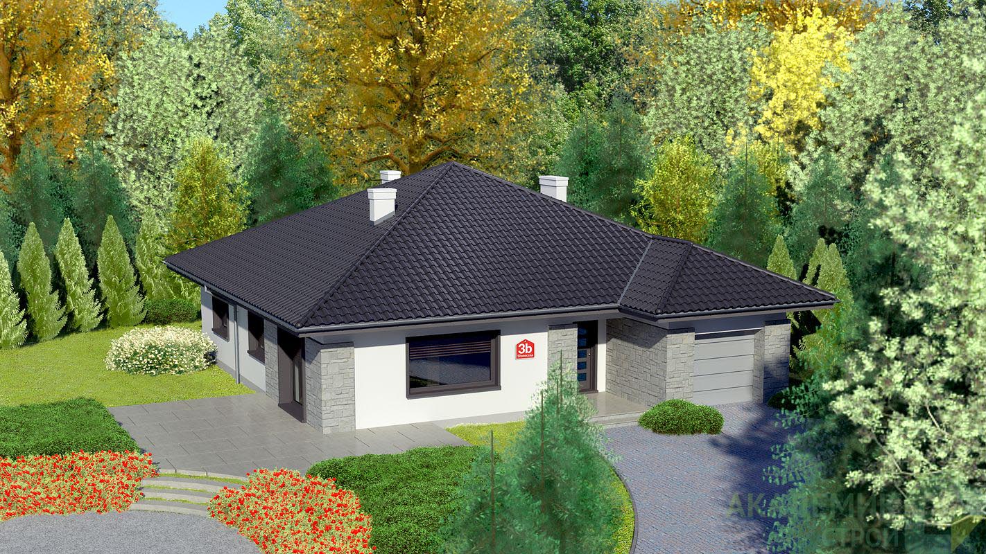 Текстура и форма крыши — значимый элемент не только в плане эстетики, но и в вопросах долговечности и энергоэффективности дома. В проекте «Одноэтажный дом 13x15» от компании "Академик Строй" используется двускатная крыша сложной формы с вальмовыми элементами. Это современное и популярное решение, которое имеет сразу несколько преимуществ.