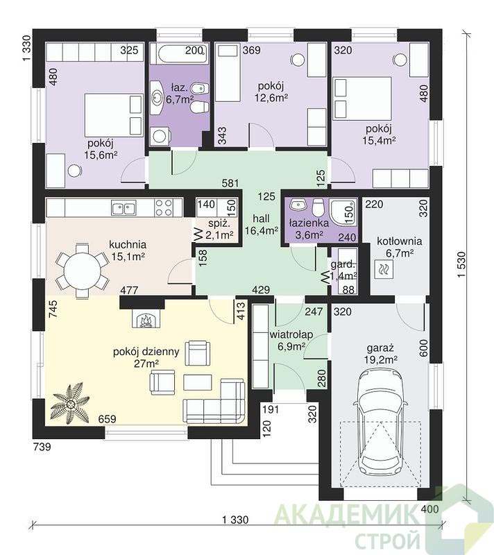 Если вы давно мечтаете о собственном доме, который будет сочетать в себе уют, комфорт и функциональность, одноэтажный дом размером 13 на 15 метров — именно то, что нужно. Компания "Академик Строй" предлагает проект, который покорит ваше сердце и поможет реализовать все мечты о загородной жизни. Общая полезная площадь дома составляет 148,7 квадратных метров — простор, которого вполне достаточно для комфортного проживания семьи из нескольких человек. Этот дом идеально подойдет для тех, кто ценит рациональное использование пространства и стремится к удобству без лишних лестниц и сложных архитектурных решений.