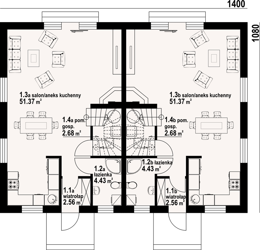 Дом с габаритами 14x11 метров имеет площадь застройки 151,20 м², что говорит о компактности и продуманной планировке. Благодаря такой площади застройки удаётся грамотно организовать пространство так, чтобы обеспечить максимум удобства для каждой комнаты и функциональной зоны.