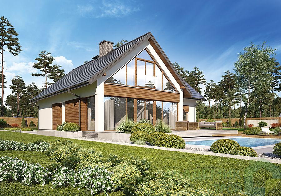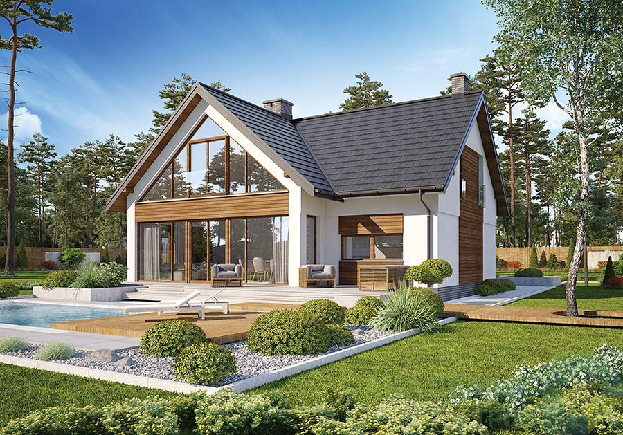 Тип двускатной крыши с углом наклона 40° применён не случайно. Такой уклон обеспечивает надежный отвод снега и дождя, что особенно важно в регионах с большим количеством осадков. Сложная форма крыши придаёт дому выразительность, исключая монотонность и делая его архитектуру более интересной.