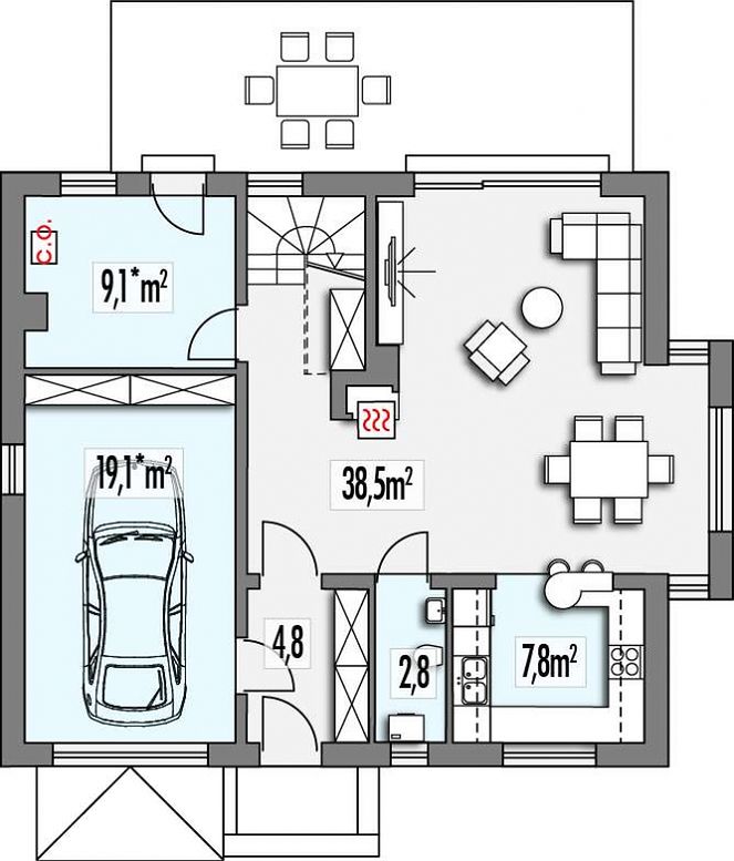 Этот проект оптимально вписывается как в загородную среду, так и в пригородные зоны, где важна экономия земли при сохранении масштабного жилого пространства. Кроме того, архитектурные элементы — камин, терраса, эркер — делают дом уютным и стильным.