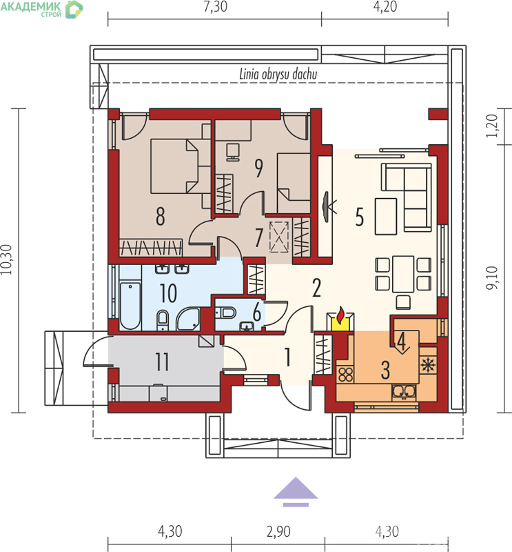 В проекте от «Академик Строй» в доме 12х10 предусмотрены все необходимые функциональные зоны. Давайте подробнее рассмотрим, как расположены комнаты и что включает в себя планировка.