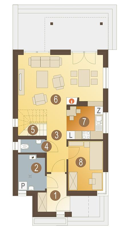 Жилая площадь проекта составляет 87 м², что довольно много для дома габаритами 7х12. Это стало возможным за счет грамотного расположения комнат и продуманного зонирования пространства. Иными словами – каждый метр тут на вес золота. Особое внимание уделено солнечному освещению и тепловым потерям, чтобы зимой в доме было тепло, а летом – прохладно.