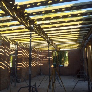 Несущие стены могут быть из ячеистого бетона, кирпича или сборных панелей; в каркасном варианте несущие элементы — стойки и балки. Важно заранее продумать места больших пролетов в гостиной и столовой: они требуют усиленных балочных решений или стальных перекрытий.