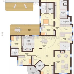 Перед вами масштабный, но эргономичный проект одноэтажного дома с наружными габаритами 23 на 32 метра и общей площадью около 369 квадратных метров. Такой дом сочетает в себе простор, удобство перемещений и гибкость планировочных решений: все основные помещения находятся на одном уровне, что удобно для семей с детьми, пожилых людей и тех, кто ценит комфорт без лестниц.