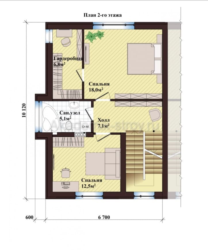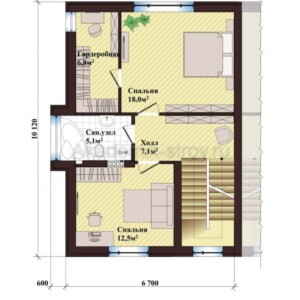 Второй этаж, как правило, отводится под личные комнаты и спальни. В данном варианте предусмотрено три спальни — оптимальное количество для семьи из 3-4 человек. Такое количество комнат позволяет не только организовать спальные места, но и оборудовать дополнительный кабинет, детскую или комнату для гостей.